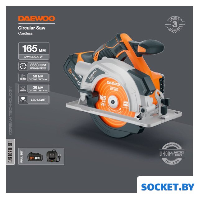Комплектация | - Циркулярная пила - 1 шт.- Зарядное устройство - 1 шт.- Аккумулятор 4,0 Ач - 1 шт.- Пильный диск - 1 шт.- Шестигранный ключ - 1 шт.- Параллельная направляющая - 1 шт.- Руководство по эксплуатации- Коробка |