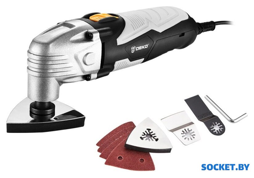 Комплект поставки | - Многофункциональный инструмент - 1 шт- Шлифовальный треугольник - 1 шт- Скребок - 1 шт- Пильное лезвие - 1 шт- Гаечный ключ - 1 шт- Шлифлисты (Р40, 60, 80, 120, 240) - 5 шт- Инструкция- Коробка |