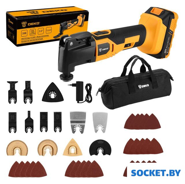 Комплект поставки | - Реноватор - 1 шт.- Аккумулятор 20В - 1 шт.- Зарядное устройство - 1 шт.- Треугольная шлифовальная платформа - 1 шт.- Плоский скребок - 1 шт.- HCS полукруглое пильное полотно - 1 шт.- HCS стандартное пильное полотно (10х40, 20х40, 45х40, 34х40) - 4 шт.- Прецизионное стандартное пильное полотно - 1 шт.- BIM стандартное пильное полотно - 1 шт.- Твердосплавное полукруглое шлифовальное лезвие 88мм - 1 шт.- Твердосплавное треугольное шлифовальное лезвие 78мм - 1 шт.- Твердосплавное полукруглое шлифовальное лезвие - 1 шт.- Шлифлисты (5хР60, 5хР120, 5хР180, 5хР240, 5хР320) - 25 шт.- Сумка - 1 шт.- Руководство по эксплуатации - 1 шт. |