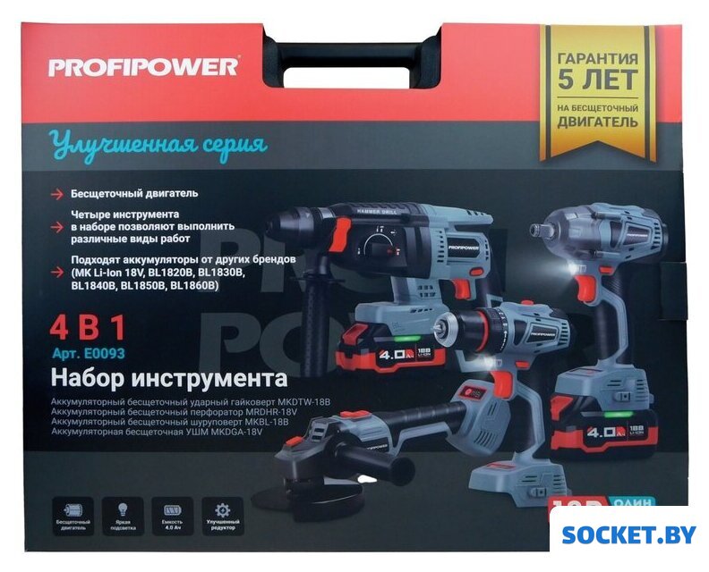 Комплектация | - Гайковерт E0081;- УШМ E0080;- Шуруповерт T0056;- Перфоратор T0058;- Набор оснастки;- Аккумуляторы - 4,0 Ач - 2шт;- Зарядное устройство;- Кейс;- Инструкции с гарантийным талоном. |