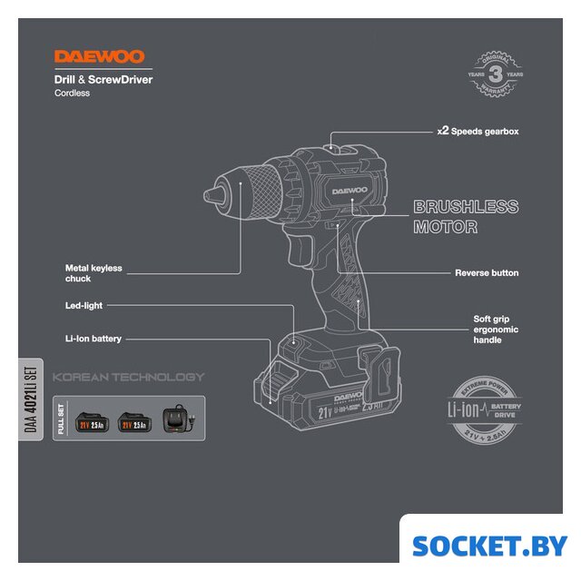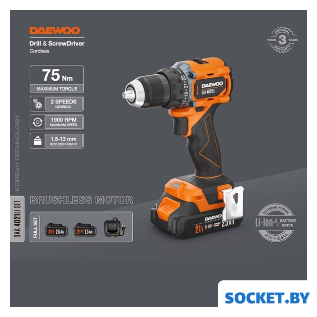 Комплектация | - Дрель-шуруповерт - 1 шт.- Аккумулятор 2,5 Ач - 2 шт.- Зарядное устройство - 1 шт.- Скоба для крепления - 1 шт.- Инструкция- Кейс |