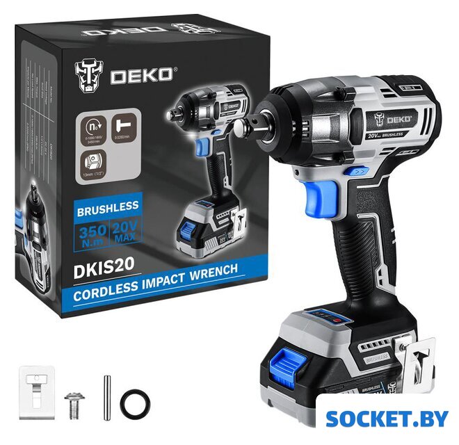 Комплектация | - Гайковерт DKIS20;- Аккумулятор - 1 шт;- Зарядное устройство;- Скоба поясная;- Уплотнительное кольцо;- Штифт;- Инструкция;- Коробка. |
