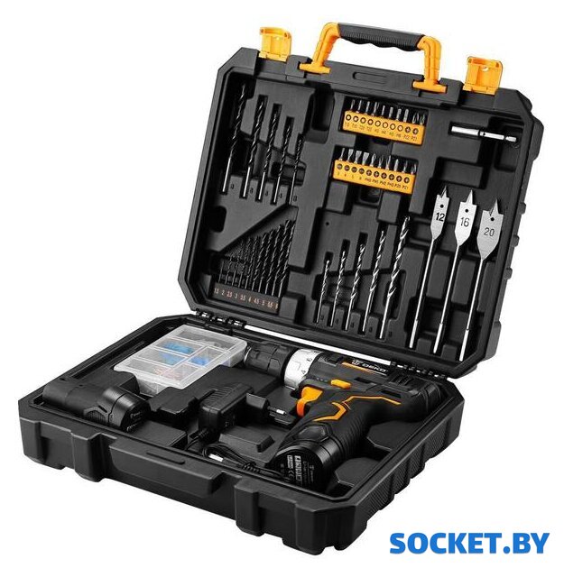 Комплектация | - Дрель-шуруповерт;- Аккумулятор - 2 шт;- Зарядное устройство;- Инструкция;- Кейс;Поставляется с набором в 92 предмета:5 шт деревообрабатывающие сверла 3,4,5,6,8мм;5 шт сверла для каменной кладки 3,4,5,6,8 мм;10 шт витые сверла 1,5,2,2,5,3,3,5,4,4,5,5,5,5,6 мм;20 шт биты 25L SL3,4,5,6, PH0,1,2,3, PZ0,1,2,3, T10,15,20,25, H3,4,5,6;1 шт магнитный держатель для бит 60 мм;3 шт плоские сверла 12,16,20 мм;48 шт набор крепежа. |