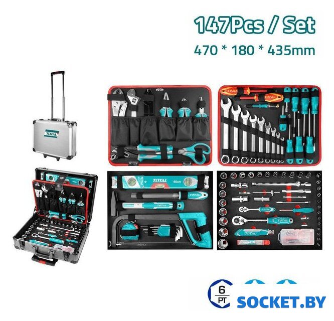 Комплектация | Ручные инструменты (56 шт.):Комбинированные плоскогубцы 7" (Cr-V) - 1 шт.Длинногубцы 6" (Cr-V) - 1 шт.Диагональные кусачки 6" (Cr-V) - 1 шт.Полукруглый стальной напильник 200 мм. - 1 шт.Уровень 40см - 1 шт.Молоток слесарный 300 г - 1 шт.Ножовка по металлу 300 мм - 1 шт.Рулетка 5 м - 1 шт.Инструмент для зачистки проводов 8,5" - 1 шт.Клещи трубные перестовные 10" - 1 шт.Разводной ключ 8" - 1 шт.Ключ для стопорных гаек с изогнутыми губками 10" - 1 шт.Ножницы электрика 5,5" - 1 шт.Изолированная шлицевая отвертка SL5*125 мм - 1 шт.Изолированная отвертка Phillips PH2*100 мм - 1 шт.Индикаторная отвертка - 1 шт.Магнитный держатель бит - 1 шт.Нож с сегментным лезвием - 1 шт.Сегментные лезвия (сменные) - 10 шт.Комбинированный ключ: 6 мм, 8 мм, 10 мм, 12 мм, 14 мм, 15 мм, 17 мм, 19 мм, 22 мм - 9 шт.Шестигранные ключи: 1,5 мм, 2 мм, 2,5 мм, 3 мм, 4 мм, 5 мм, 6 мм, 8 мм, 10 мм - 9 шт.Биты 25 мм: PH0, PH1, PH2, PH3, PZ0, PZ1, SL3, SL4, SL5, SL6 - 10 шт.Шлицевые отвертки S2 Steel (4 шт.):Отвертка SL8*150 ммОтвертка SL6*125 ммОтвертка SL5*100 ммОтвертка SL6,5*38 ммКрестовые отвертки Phillips S2 Steel (3 шт.):Отвертка РН2*150 мм - 1 шт.Отвертка PH1*100 мм - 1 шт.Отвертка PH2*38 мм - 1 шт.Нобор инструментов 1/2" (25 шт.):Шестигранных головок 1/2": 10 мм, 11 мм, 12 мм, 13 мм, 14 мм, 15 мм, 16 мм, 17 мм, 18 мм, 19 мм, 20 мм, 21 мм, 22 мм, 23 мм, 24 мм, 27 мм, 30 мм, 32 мм. - 18 шт.Трещотка 1/2", 45 зуб. - 1 шт.Трехходовой адаптер: 1/2" на 3/8" - 1 шт.Карданный шарнир 1/2" - 1 шт.Свечные головки: 16 мм, 21 мм - 2 шт.Удлинитель 1/2" 125 мм (5") - 1 шт.Удлинитель 1/2" 250 мм (10") - 1 шт.Нобор инструментов 1/4" (21 шт.):Шестигранные головок 1/4": 4 мм, 4,5 мм, 5 мм, 5,5 мм, 6 мм, 7 мм, 8 мм, 9 мм, 10 мм, 11 мм, 12 мм, 13 мм, 14 мм. - 13 шт.Трещотка 1/4", 45 зуб. - 1 шт.Вороток-отвертка 1/4" 150 мм - 1 шт.Карданный шарнир 1/4" - 1 шт.Удлинитель 1/4" 50 мм (2") - 1 шт.Удлинитель 1/4" 100 мм (4") - 1 шт.Гибкий удлинитель 1/4" 150 мм (6") - 1 шт.Магнитный хвостовик 1/4" - 1 шт.Держатель бит 1/4" - 1 шт.Винты (36 шт.)Шуруп для ДВП 2,5 мм - 8 шт.Шуруп для ДВП 5 мм - 8 шт.Саморез 2,5 мм - 10 шт.Саморез 5 мм - 10 шт.Упаковка:Алюминиевый чемодан с выдвижной ручкой -1 шт.Картонная коробка |