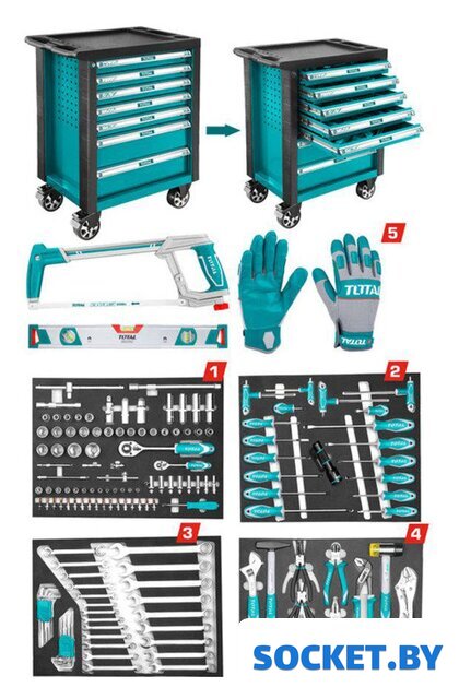 Комплектация | Инструментальная тележка с 7 ящиками:Ролики: 5" * 2" (с тормозами)Ящики 536x410x74,5 мм - 5 шт.Ящики 536x410x153,3 мм - 2 шт.Замок - 1 шт.Ящик № 1 (80 шт.):Ключ 1/4" с трещоткой (45T) - 1 шт.Шестигранные головоки 1/4": 4 мм, 4,5 мм, 5 мм, 5,5 мм, 6 мм, 7 мм, 8 мм, 9 мм, 10 мм, 11 мм, 12 мм, 13 мм, 14 мм. - 13 шт.Насадки 1/4" (32 мм): шестигранник 3 мм, шестигранник 4 мм, шестигранник 5 мм, шестигранник 6 мм, T8, T10, T15, T20, T25, T30, SL4, SL5.5, SL7, PH1, PH2, PZ1, ПЗ2 - 17 шт.Длинные головки 1/4" (50мм): 6мм, 7мм, 8мм, 9мм, 10мм, 11мм, 12мм, 13мм - 8 шт.Удлинитель 1/4": 50 мм, 100 мм - 2 шт.Ручка для торцевых головок 1/4" 150 мм - 1 шт.Гибкий удлинитель, 150 мм - 1 шт.Универсальный шарнир 1/4" - 1 шт.Скользящий Т-образный вороток для торцевых головок 1/4" 114 мм - 1 шт.Ключ с трещоткой 1/2" - 1 шт.Шестигранные головки 1/2": 8 мм, 10 мм, 11 мм, 12 мм, 13 мм, 14 мм, 15 мм, 16 мм, 17 мм, 18 мм, 19 мм, 20 мм, 21 мм, 22 мм, 23 мм, 24 мм, 27 мм, 30 мм, 32 мм - 19 шт.Длинные головки 1/2" (77мм): 14мм, 15мм, 17мм, 19мм - 4 шт.Звездообразные головки 1/2": E10, E12, E14, E16, E20 - 5 шт.Универсальный шарнир 1/2" - 1 шт.Скользящий Т-образный вороток для торцевых головок 1/2" 250 мм - 1 шт.Удлинитель 1/2": 125 мм, 250 мм - 2 шт.Свечные головки 1/2": 16мм, 21мм - 2 шт.Ящик № 2 (19 шт.):Отвертки: SL3*75мм, SL4*100мм, SL5.5*100мм, SL6.5*38мм, SL6.5*125мм, SL6.5*150мм, SL8*200мм, PH0*75мм, PH1*75мм, PH1* 100мм, ПХ2*38мм, ПХ2*125мм, ПХ2*150мм, ПХ3*200мм - 14 шт.Ключ с Т-образной рукояткой: 3*100 мм, 4*100 мм, 5*150 мм, 6*150 мм - 4 шт.Фонарик - 1 шт.Ящик № 3 (40 шт.):Комбинированные гаечные ключи: 6 мм, 7 мм, 8 мм, 9 мм, 10 мм, 11 мм, 12 мм, 13 мм, 14 мм, 15 мм, 16 мм, 17 мм, 18 мм, 19 мм, 21 мм, 22 мм, 24 мм. - 17 шт.Накидные гаечные ключи: 8*10 мм, 10*12 мм, 11*13 мм, 12*14 мм, 17*19 мм - 5 шт.Шестигранные ключи: 1,5 мм, 2 мм, 2,5 мм, 3 мм, 4 мм, 5 мм, 6 мм, 8 мм, 10 мм - 9 шт.Ключей Torx: T10, T15, T20, T25, T27, T30, T40, T45, T50 - 9 шт.Ящик № 4 (14 шт.):Плоскогубцы с изогнутыми губками, 10" - 1 шт.Резиновый и пластиковый молоток, 40 мм. - 1 шт.Клещи переставные 10" - 1 шт.Молоток слесарный 300 г - 1 шт.Комбинированные плоскогубцы 8" - 1 шт.Длинногубцы 6" - 1 шт.Диагональные кусачки 7" - 1 шт.Универсальный нож - 1 шт.Плоскогубцы - 4 шт.Разводной ключ 10" - 1 шт.Рулетка 5м * 19мм - 1 шт.Ящик № 5 (8 шт.):Перчатки - 1 шт.Ножовка - 1 шт.Уровень (с мощным магнитом) - 1 шт.Железный крючок для подвешивания инструментов - 5 шт. |