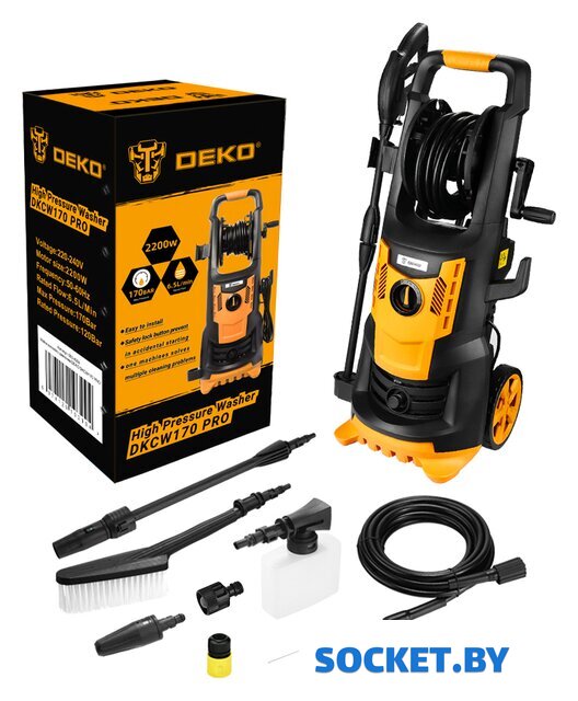 Комплектация | Мойка высокого давленияПистолет Шланг высокого давленияНасадка-распылитель Насадка-щёткаЕмкость для моющих средств ИнструкцияКоробка |