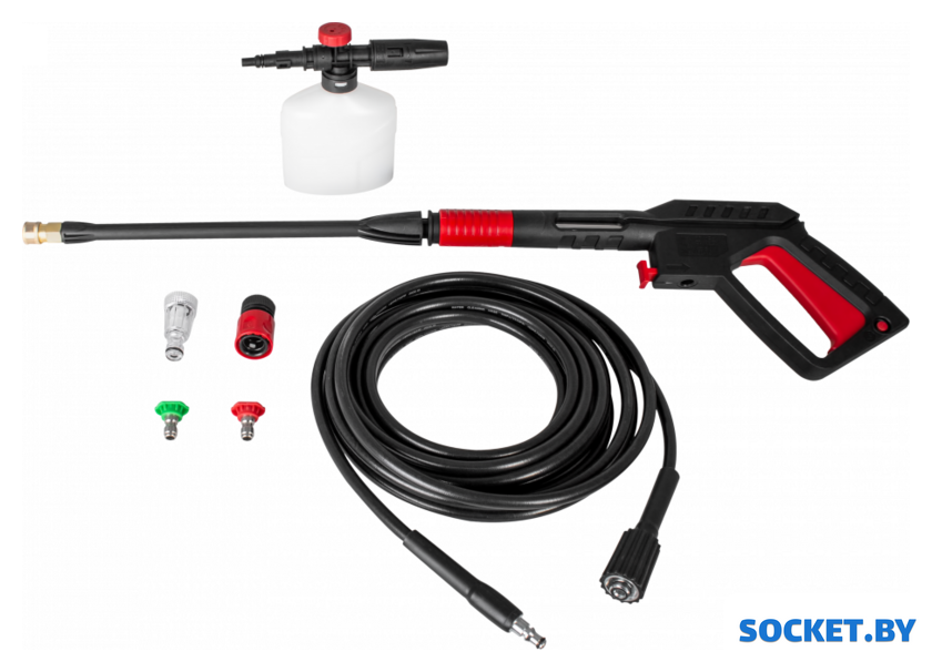Комплектация | - Мойка высокого давления 1 шт.- Пистолет-распылитель разборный 1 шт.- Шланг высокого давления 1 шт.- Пеногенератор 1 шт.- Игла для очистки сопла 1 шт.- Сменные форсунки 2 шт.- Фильтр 1 шт.- Быстросъёмный коннектор для подачи вод |